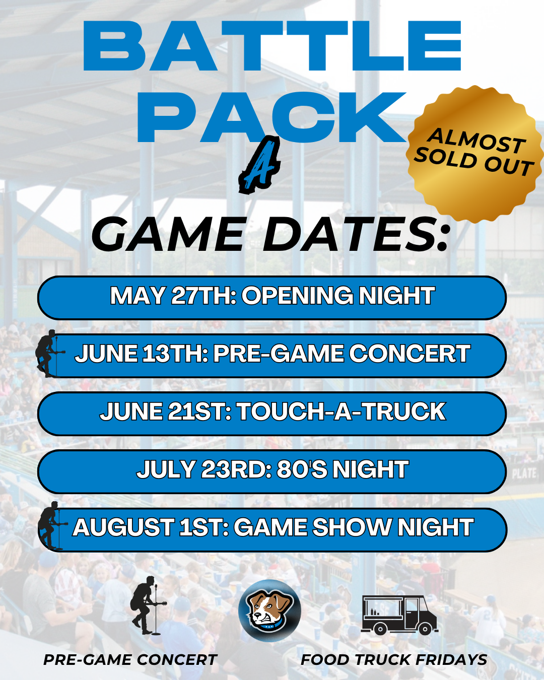 The 2026 season is shaping up to be our biggest and best yet; packed with new upgrades, incredible food, and nonstop Battle Jacks fun! Get closer to the action with the all-new Battle Pack, featuring premium seats, our new “9 and Dine” meal experience, and exclusive member perks you won’t find anywhere else.