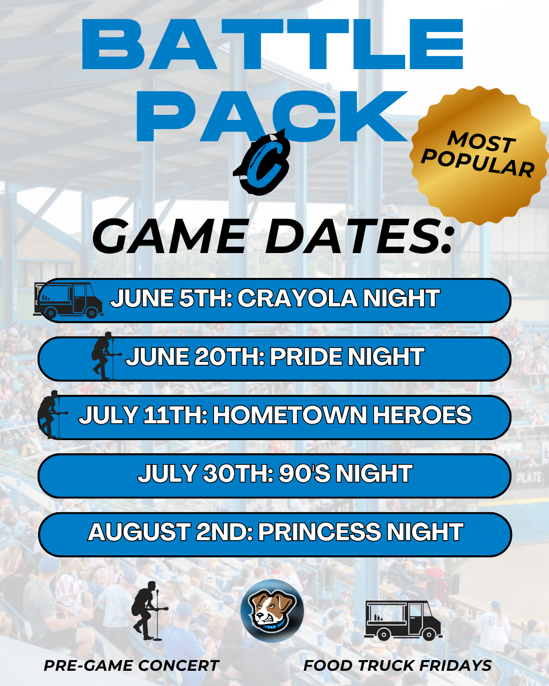 Enjoy great food, great seats, and great memories, all in one package. Choose from pre-selected games or enjoy the flexibility to use your tickets how you want. The Battle Pack is your all-access pass to the best baseball nights in Battle Creek!