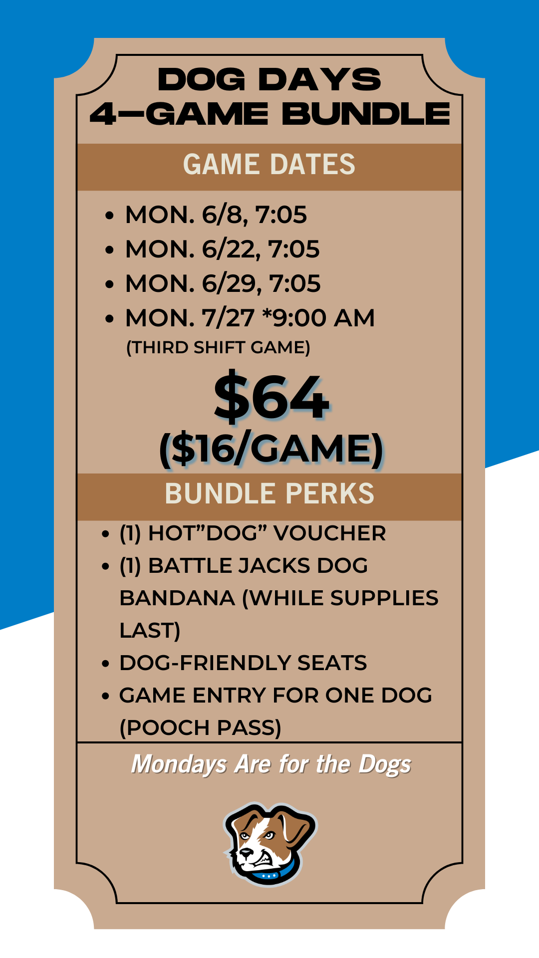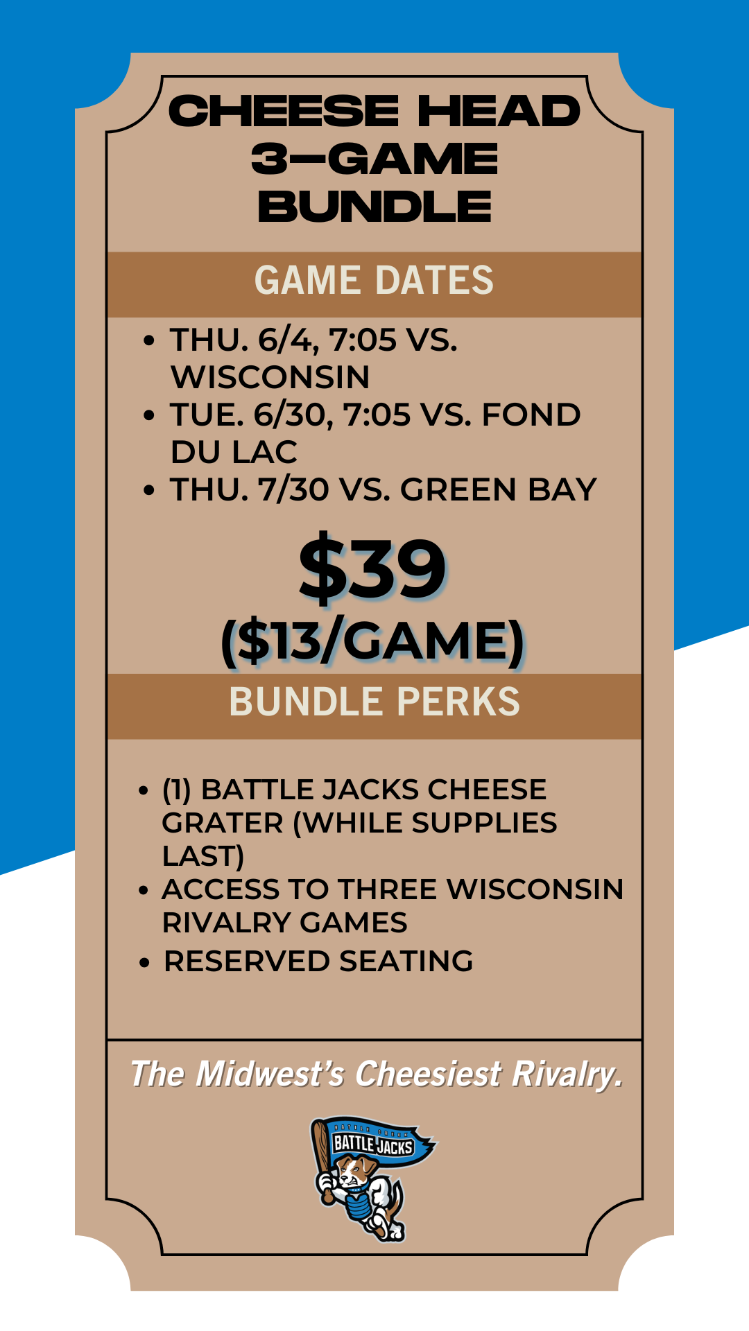 More games. More memories. More summer nights at the ballpark. Battle Jacks 3 & 4 Game Ticket Bundles are designed to give fans the best of the season. Exciting matchups, themed nights, giveaways and incredible value all wrapped into one easy package. Grab your bundle and get ready for unforgettable nights at MCCU Field.