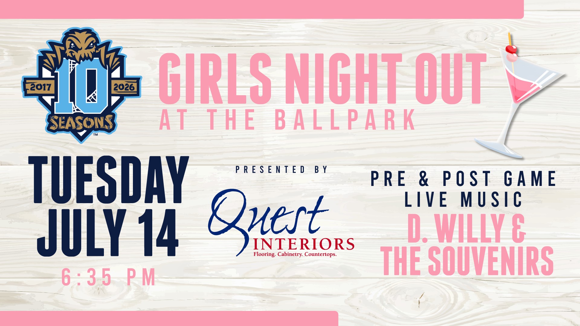 Join us for Girls Night Out on Tuesday, July 14th, presented by Quest Interiors! Enjoy food & drink specials, PLUS pre and post-game live music from D. Willy and The Souvenirs!