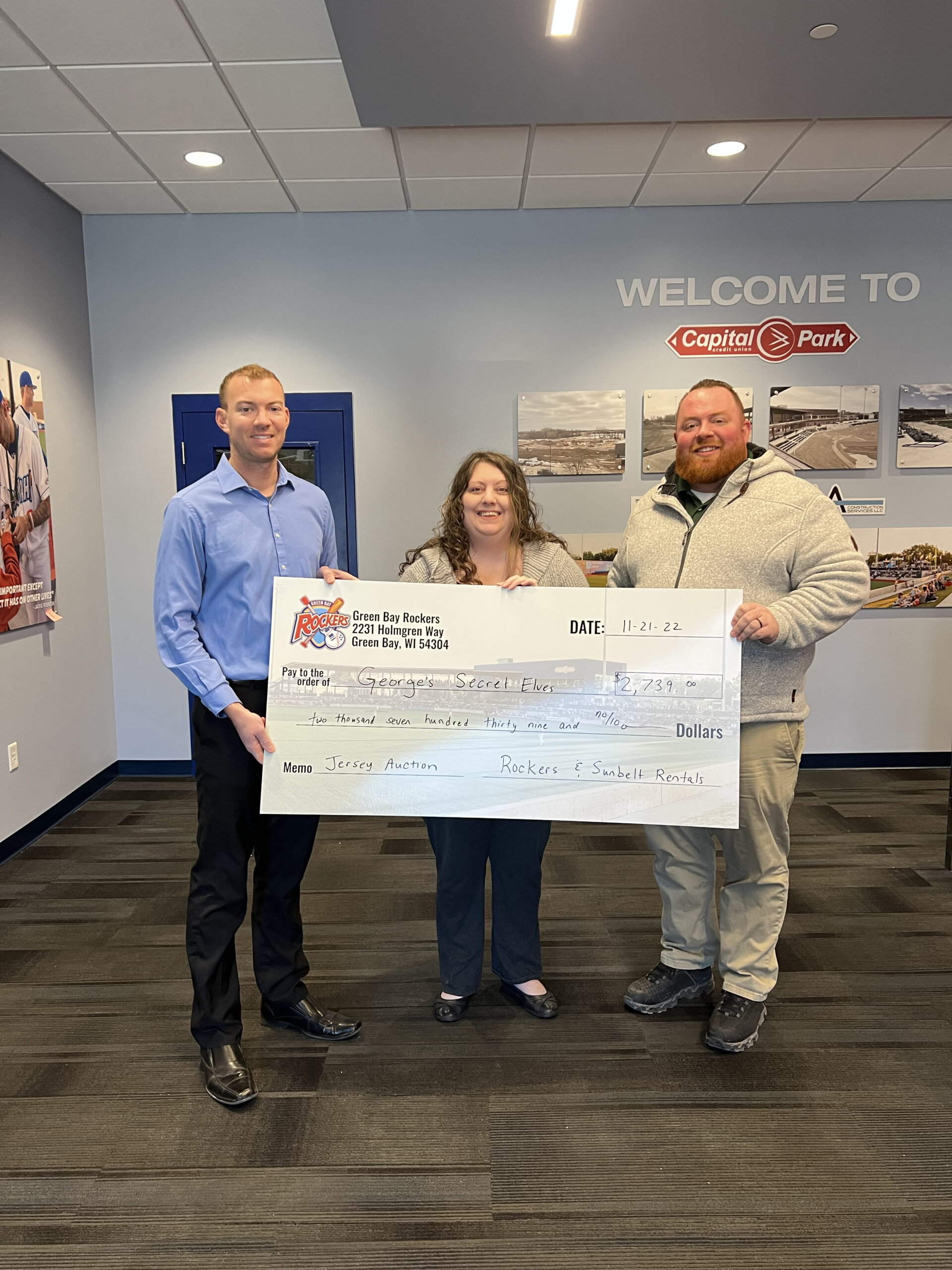 Rockers GM John Fanta and Sunbelt Rentals Branch Manager Bryan Anderson present a check to George’s Secret Elves.