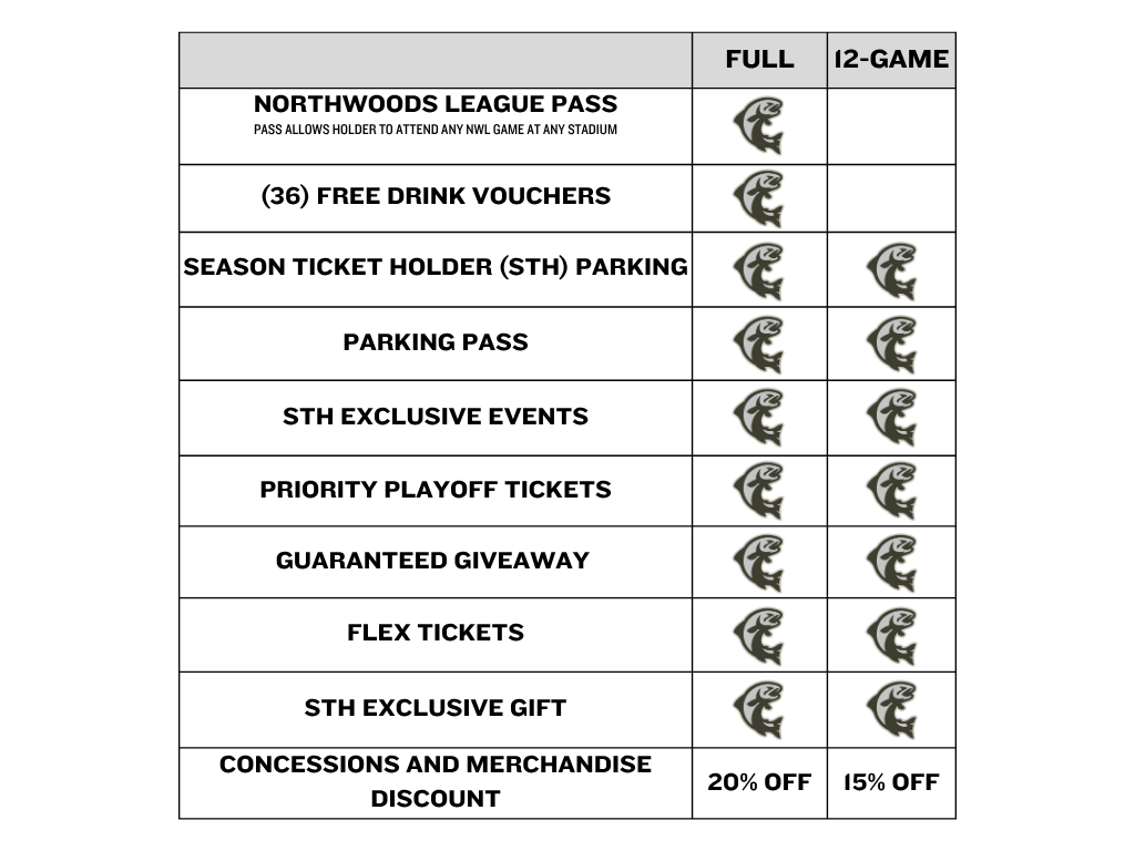Never miss a game! Full Season Members will receive a number of great benefits such as the Northwoods League pass, special parking, and guaranteed giveaways.