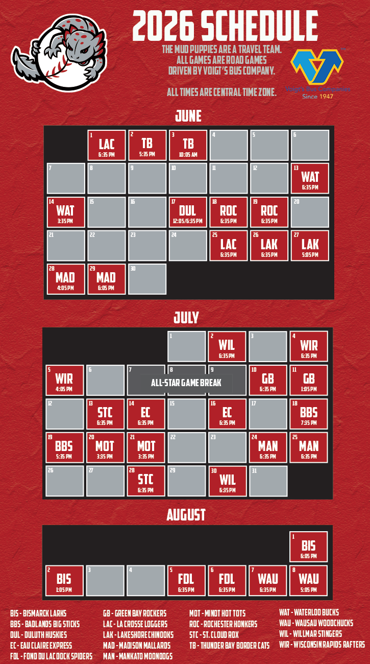 In 2026, the Mud Puppies play 18 different NWL teams…the most by any Northwoods League team. All of their games are ROAD games. If you are interested in watching the Mud Puppies in person, please contact the HOME teams listed about when single-game tickets will go on sale.