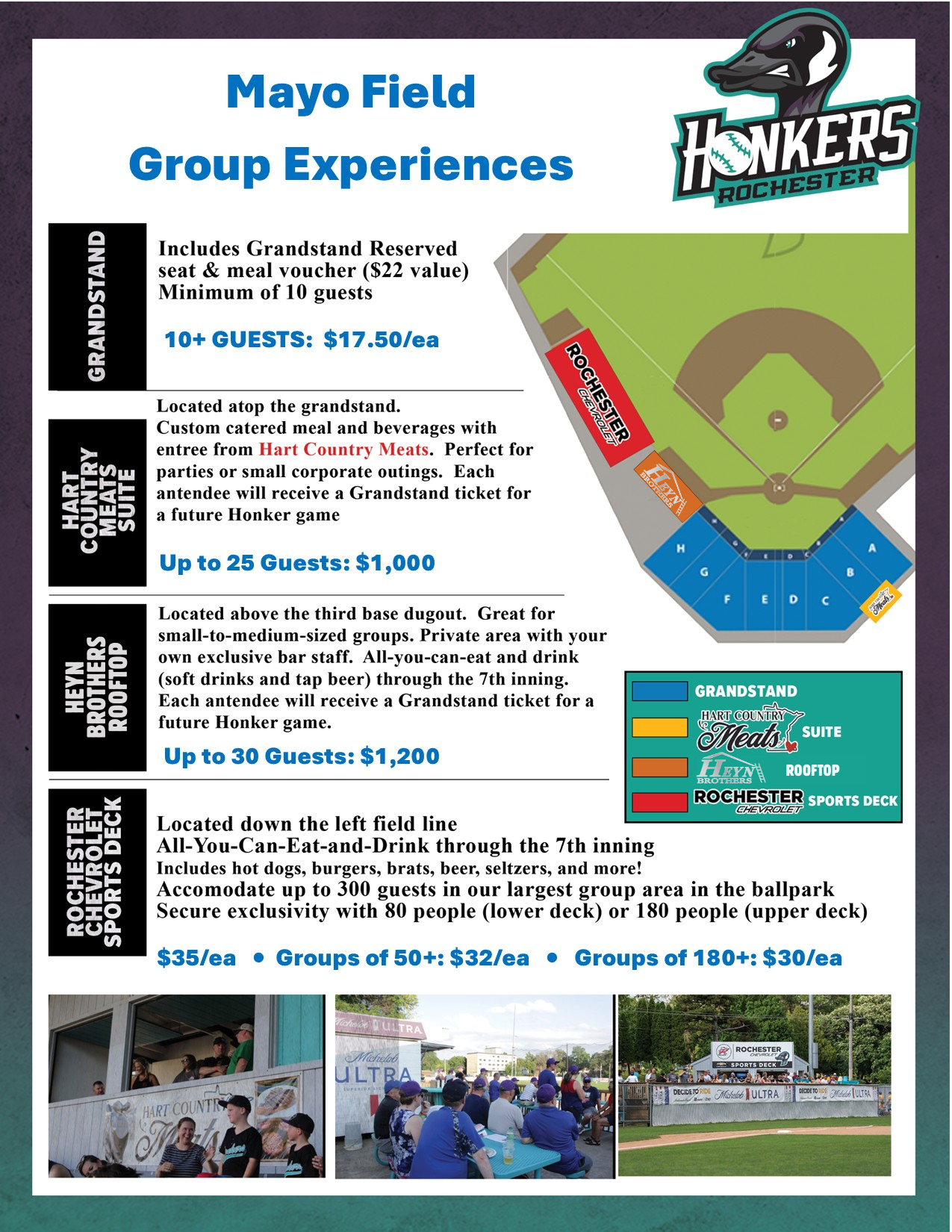 Planning a company get together, family reunion, birthday, or corporate event? A Honkers game at Mayo Field is the perfect place to entertain guests of all ages! Honkers group packages cater to flocks as small as 10 or as large as 3,000 with something to fit everyone’s budget!