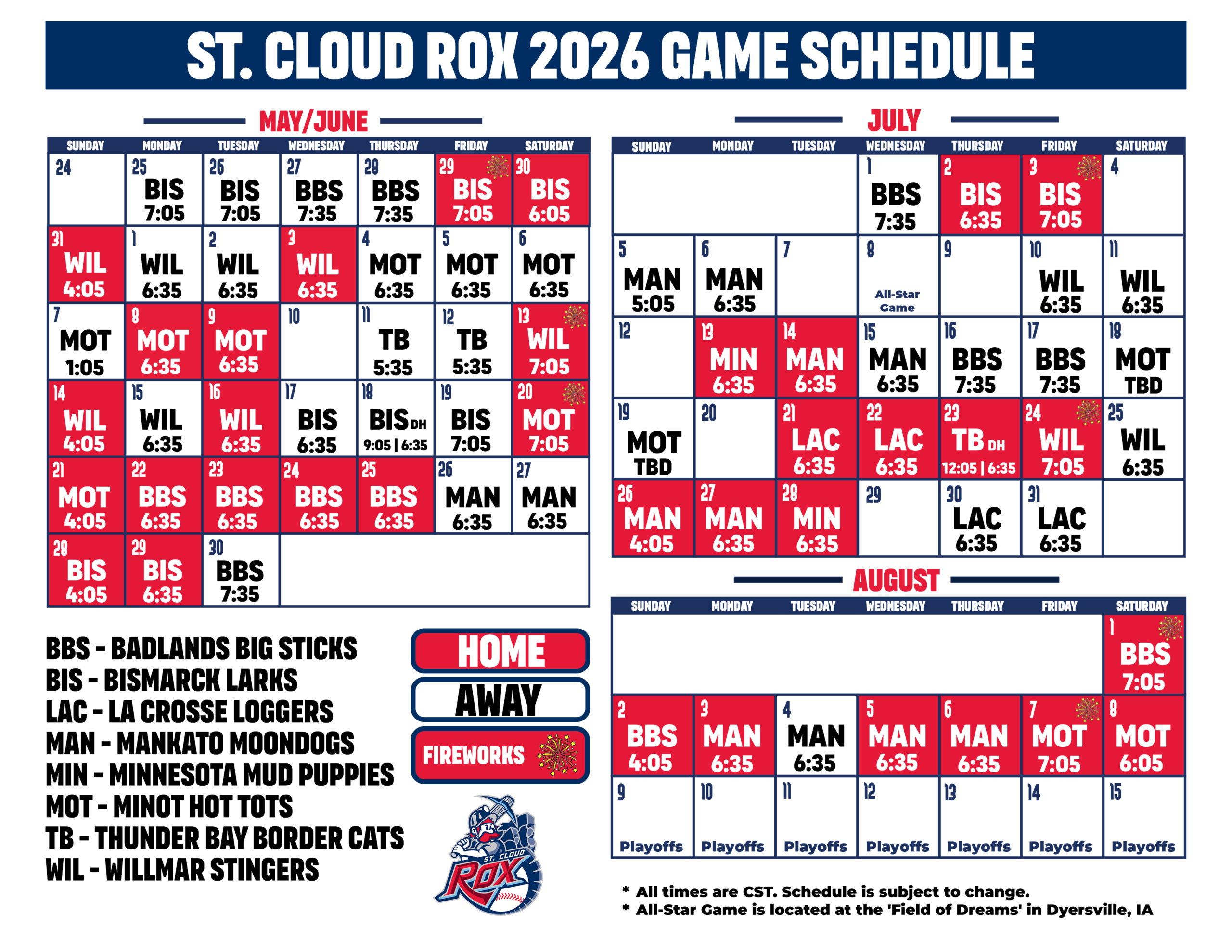 The St. Cloud Rox announced their complete 70-game schedule for the 2026 season, including the home opener on Friday, May 29th at 7:05 pm against the Bismarck Larks at Joe Faber Field. The home opener will feature post-game fireworks presented by Coborn’s.