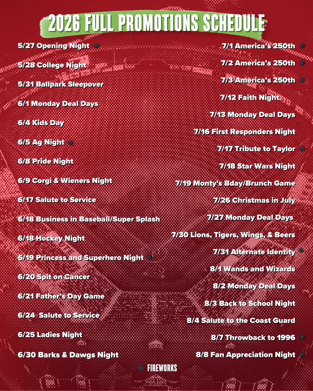 - America’s 250th Birthday, Friday, July 3rd– Celebrate 250 years of America with an unforgettable night at Turtle Creek Stadium! Enjoy a spectacular postgame fireworks display, a special jersey auction benefitting the 4Front Foundation, and a hat giveaway for the first 500 fans presented by 4Front Credit Union. It’s a red, white, and blue celebration you won’t want to miss!