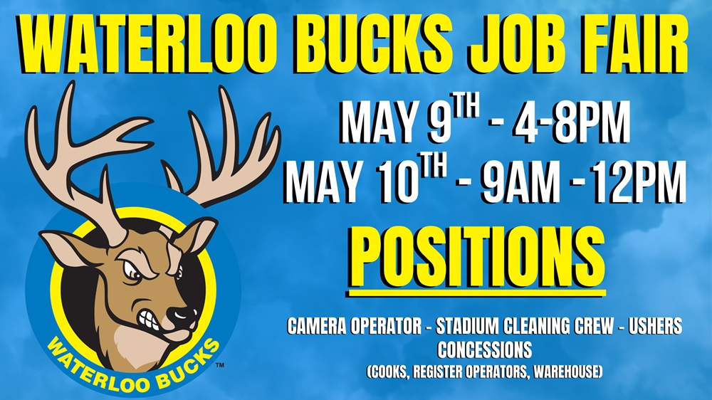 Waterloo, Iowa – The Waterloo Bucks have announced they will be holding Job Fairs for summer game-day positions on Friday, May 8 from 4:00 pm to 8:00 pm and Saturday, May 9 from 9:00 am to 12:00 pm. The Bucks offer individuals the opportunity to make some extra money during the summer months while working in a fun-filled atmosphere.