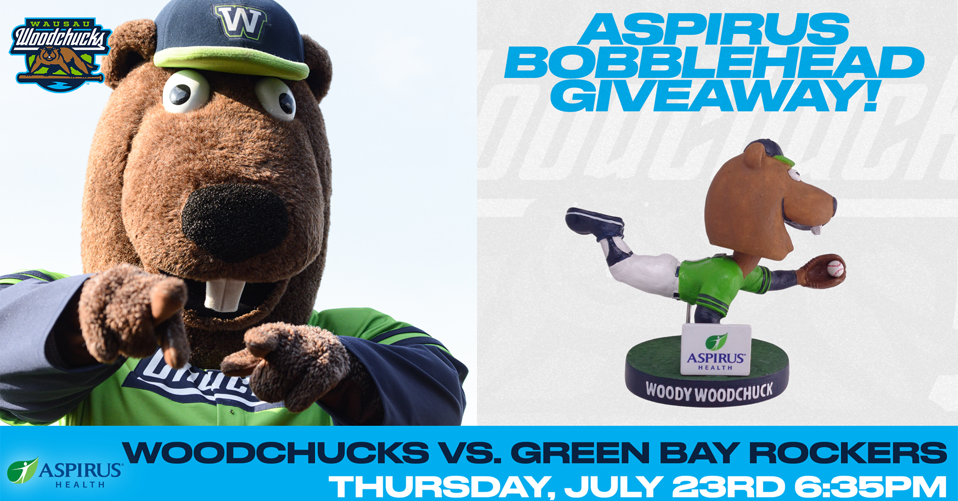 Aspirus Diving Woody Bobblehead Giveaway: The first 500 fans through the gate will receive a Diving Catch Woody Bobblehead, courtesy of Aspirus. Buy now to guarantee your bobblehead for $15!