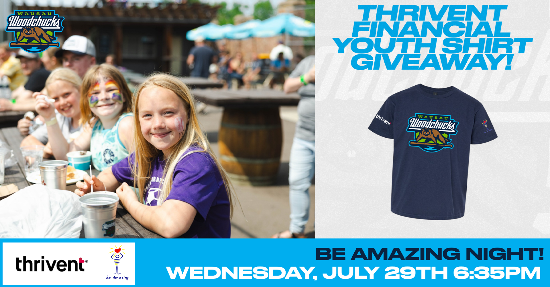 Be Amazing x Thrivent Financial Youth T-Shirt Giveaway: The first 500 youth fans will receive a free Woodchucks T-Shirt courtesy of Thrivent Financial.