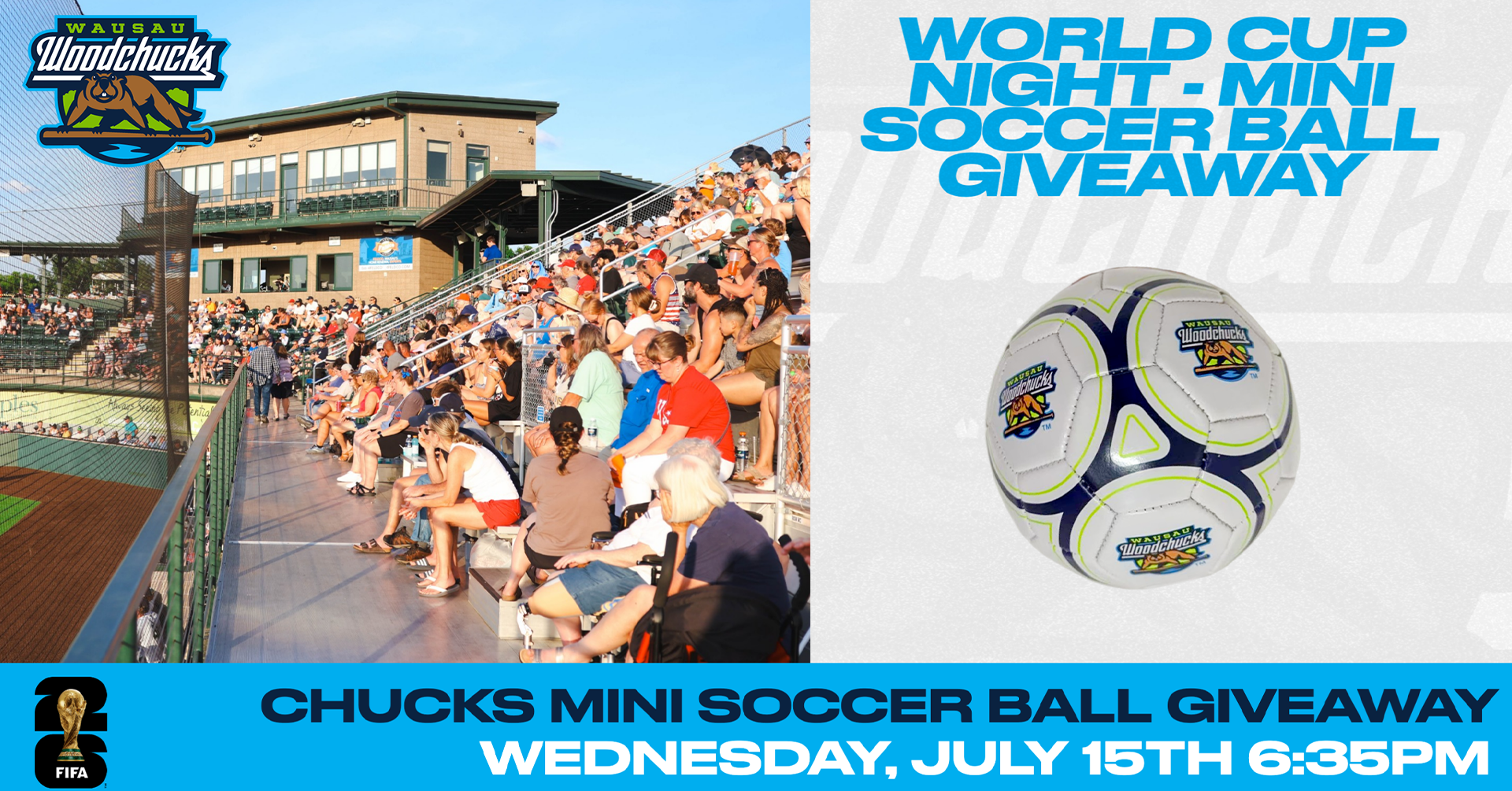 World Cup Night: Celebrate the start of the World Cup. The first 500 fans through the gates will get a Woodchucks mini soccer ball!