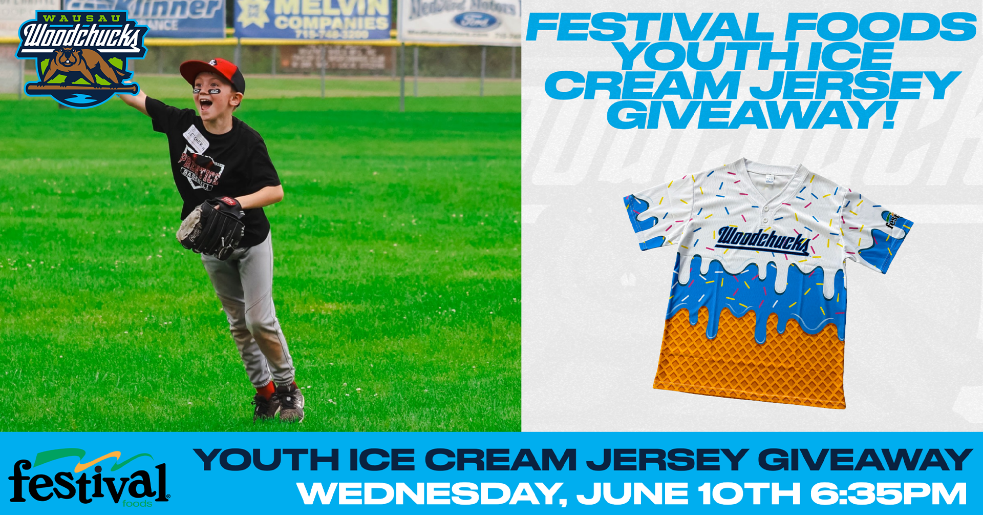 Festival Foods Youth Ice Cream Jersey Giveaway: The first 500 kids (under 18) will receive a free Woodchucks Ice Cream Jersey, presented by Festival Foods!