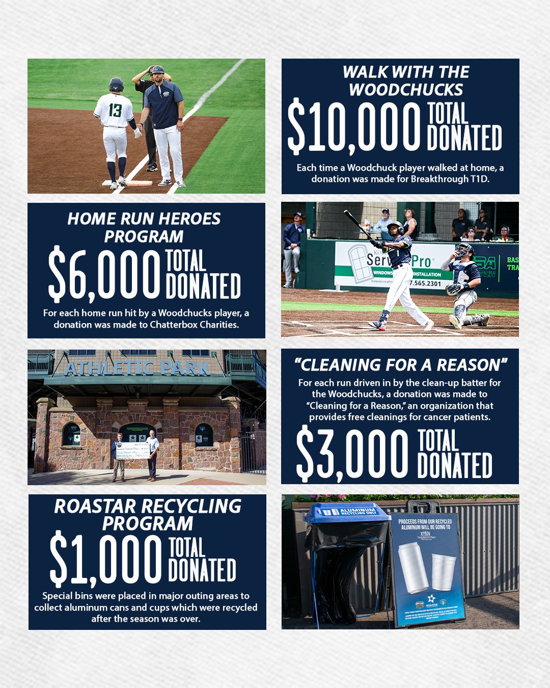 The Woodchucks are happy to come alongside partners in the community to raise money for important community organizations. First, the Woodchucks partnered with Crystal Finishing Systems for the Walk with the Woodchucks initiative to raise money for Breakthrough T1D. Each time a Woodchuck player walked at home, a donation was made through this initiative for a total of $10,000 by the end of the season. The team also partnered with K-tech Kleening Systems for our Home Run Heroes program. This season, for each home run hit by a Woodchucks player, a donation was made to Chatterbox Charities to continue the development of the “Graze the Market” program to educate students on local and healthy food options, totaling $6,000. Lastly, in partnership with Executive Cleaning, for each run driven in by the clean-up batter for the Woodchucks, a donation was made to “Cleaning for a Reason,” an organization that provides free cleanings for cancer patients. This season, the team was able to raise $3,000.