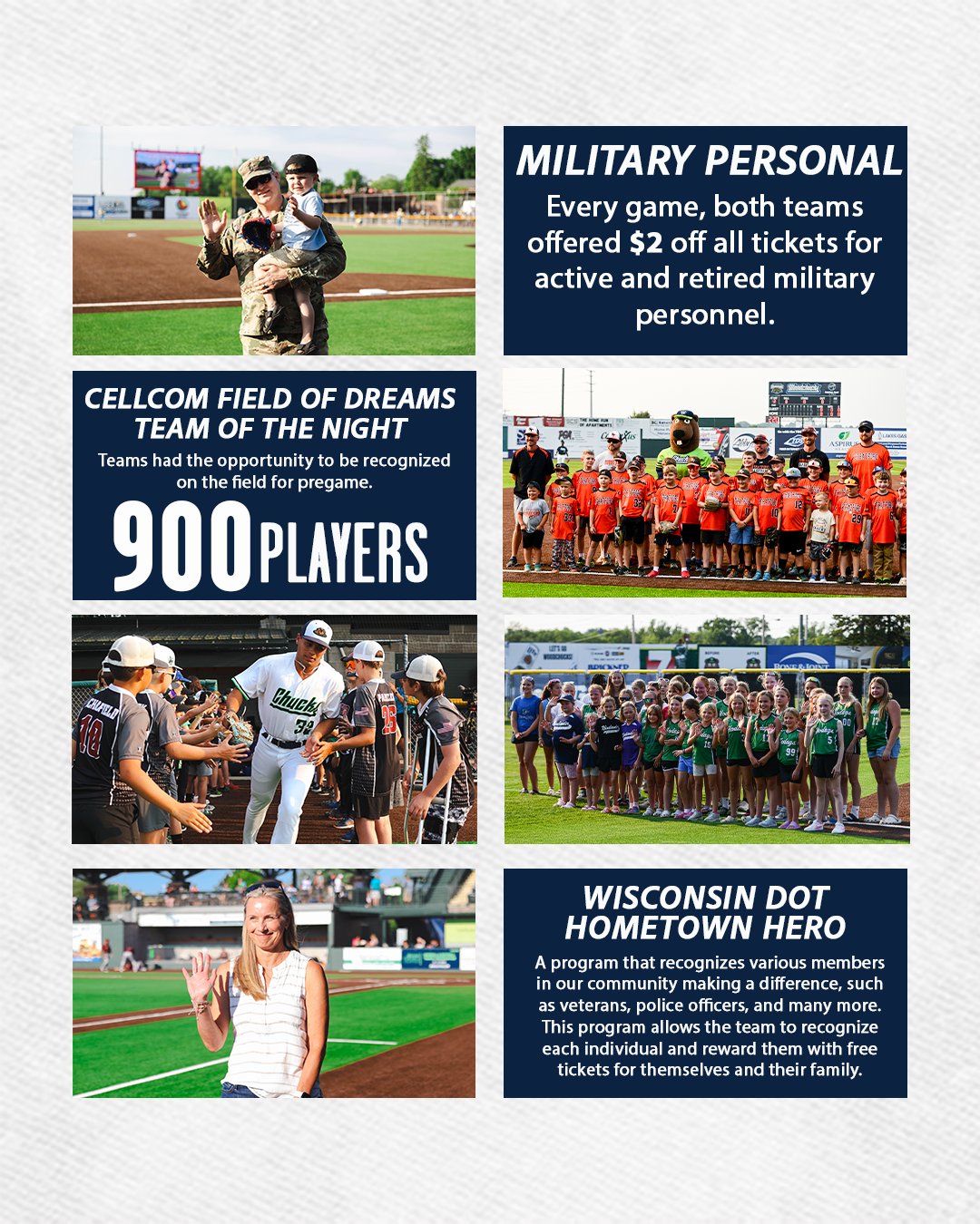 At each game during the Woodchucks and Ignite seasons, the teams sought to recognize groups and individuals in the community who are making a difference. Every game, both teams offered $2 off all tickets for active and retired military personnel. Each team also welcomed a Cellcom Field of Dreams Team of the Night every game of the season. Players received a hat, were able to high-five the teams as the starting line-up was announced and stood with the Woodchucks and Ignite for the National Anthem on the field. Combined, both teams welcomed over 900 players to the field this summer from various organization across Northcentral Wisconsin. The Woodchucks continued to partner with the Wisconsin DOT to provide the Hometown Heroes program, a program that recognizes various members in our community making a difference, such as veterans, police officers, and many more. This program allows the team to recognize each individual and reward them with free tickets for themselves and their family. In addition to this, the Woodchucks held two Teacher Appreciation Nights for area teachers to allow them to relax before a new year of school begins. Finally, the Woodchucks partnered with Connexus Credit Union for the Organization of the Night program to offer recognition and appreciation for nonprofit organizations serving Wausau community.