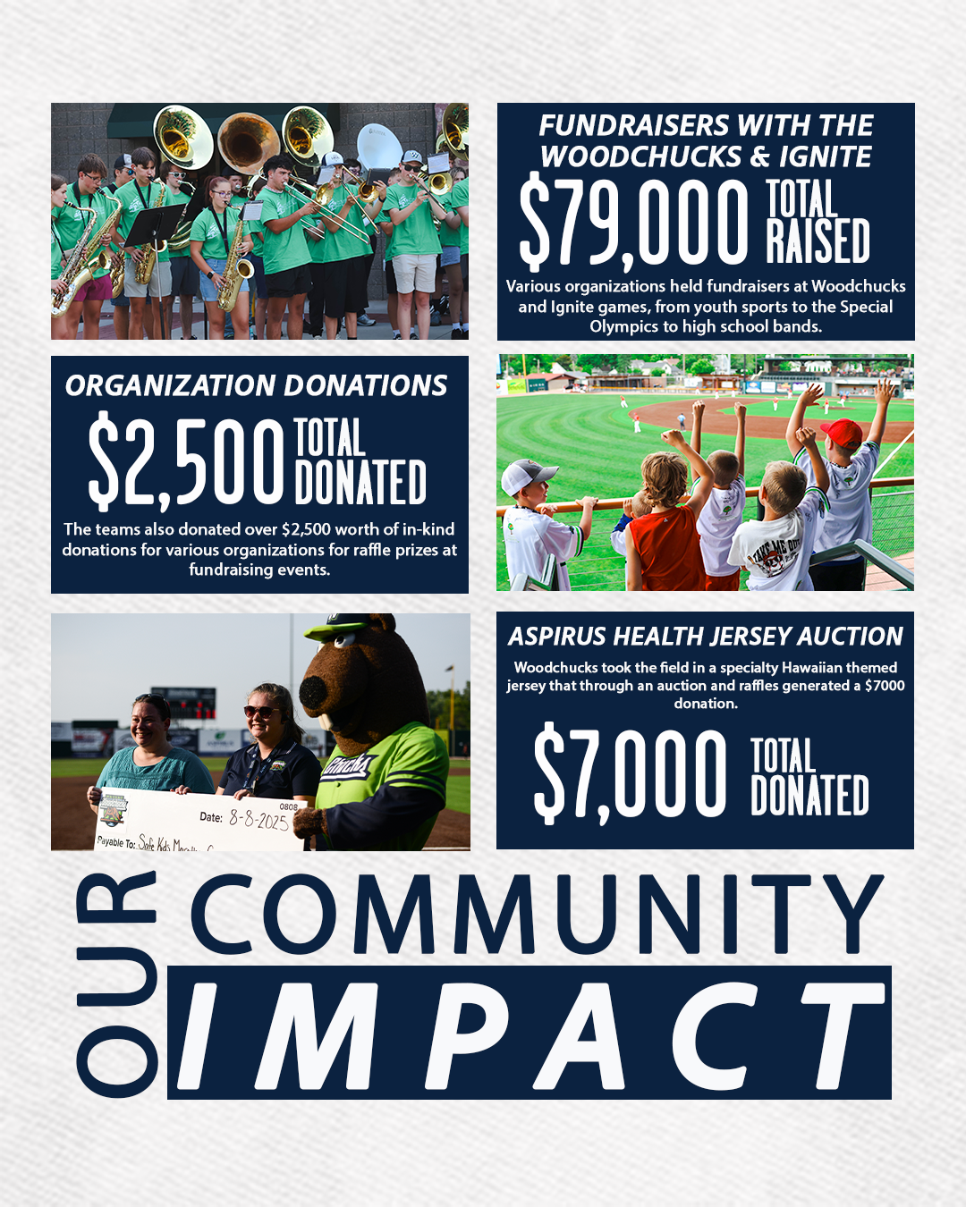 Throughout the season, various organizations held fundraisers at Woodchucks and Ignite games, from youth sports to the Special Olympics to high school bands. These organizations in total raised $79,000 to continue to thrive in our community and beyond. In addition to these fundraisers, the teams also donated over $2,500 worth of in-kind donations to various organizations for raffle prizes at fundraising events.