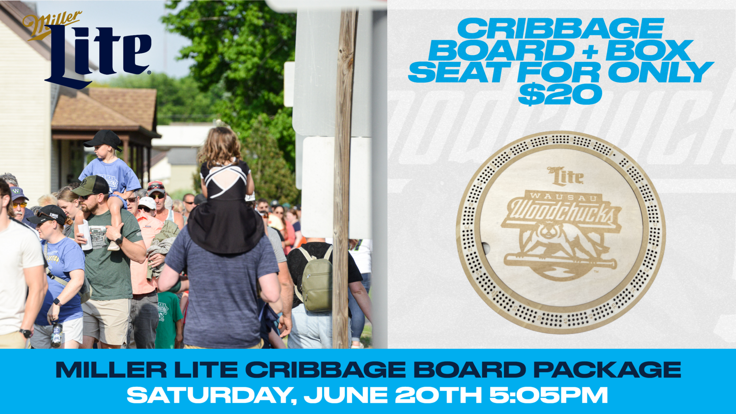 Miller Lite Cribbage Board Package: Get your hands on the exclusive Miller Lite and Wausau Woodchucks Cribbage Board with a box seat for only $20. Limited packages available for pre-sale! Get yours before time runs out!