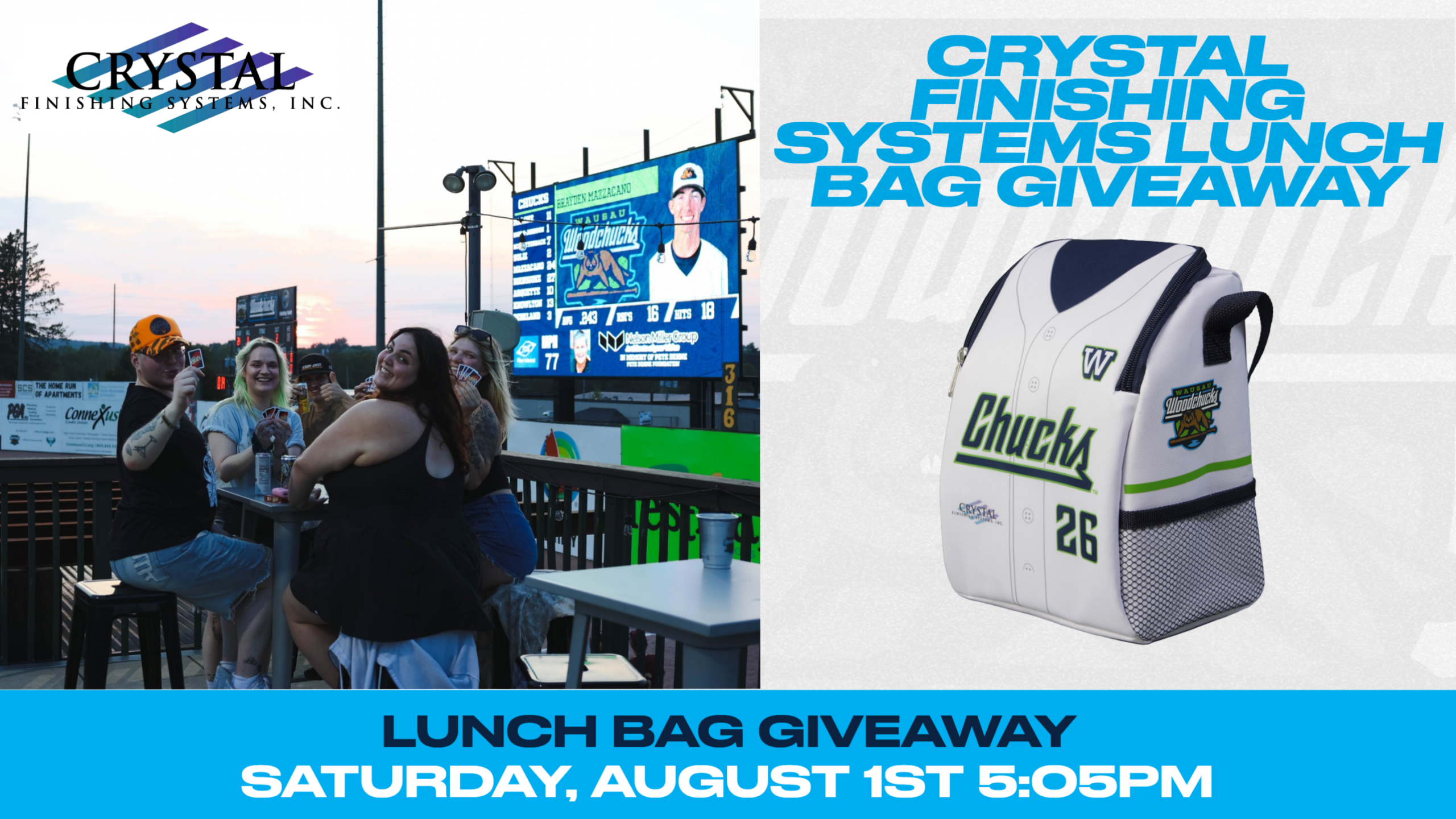 Saturday, August 1st vs. Lakeshore Chinooks – 5:05 PM First Pitch Crystal Finishing Systems Lunch Bag Giveaway: The first 500 fans will receive a Woodchucks Lunch Cooler Bag, courtesy of Crystal Finishing Systems. Buy now to guarantee your lunch cooler bag for $15! Festival Foods Family Ticket Night: $12 tickets, include a brat and a tap soda. Fun for the whole family! |
