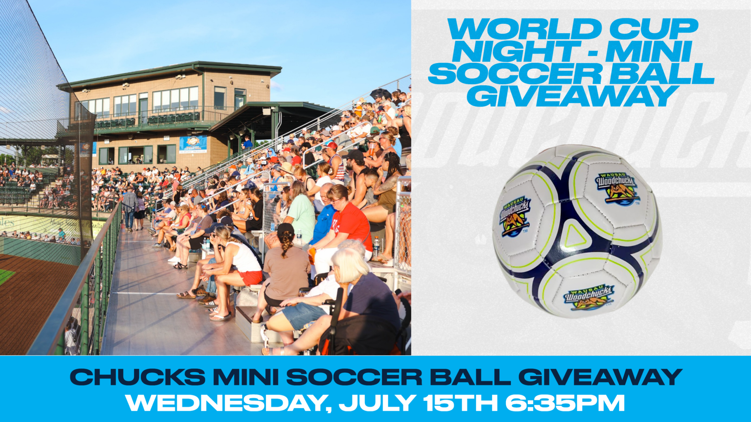 World Cup Night: Celebrate the start of the World Cup. The first 500 fans through the gates will get a Woodchucks mini soccer ball!