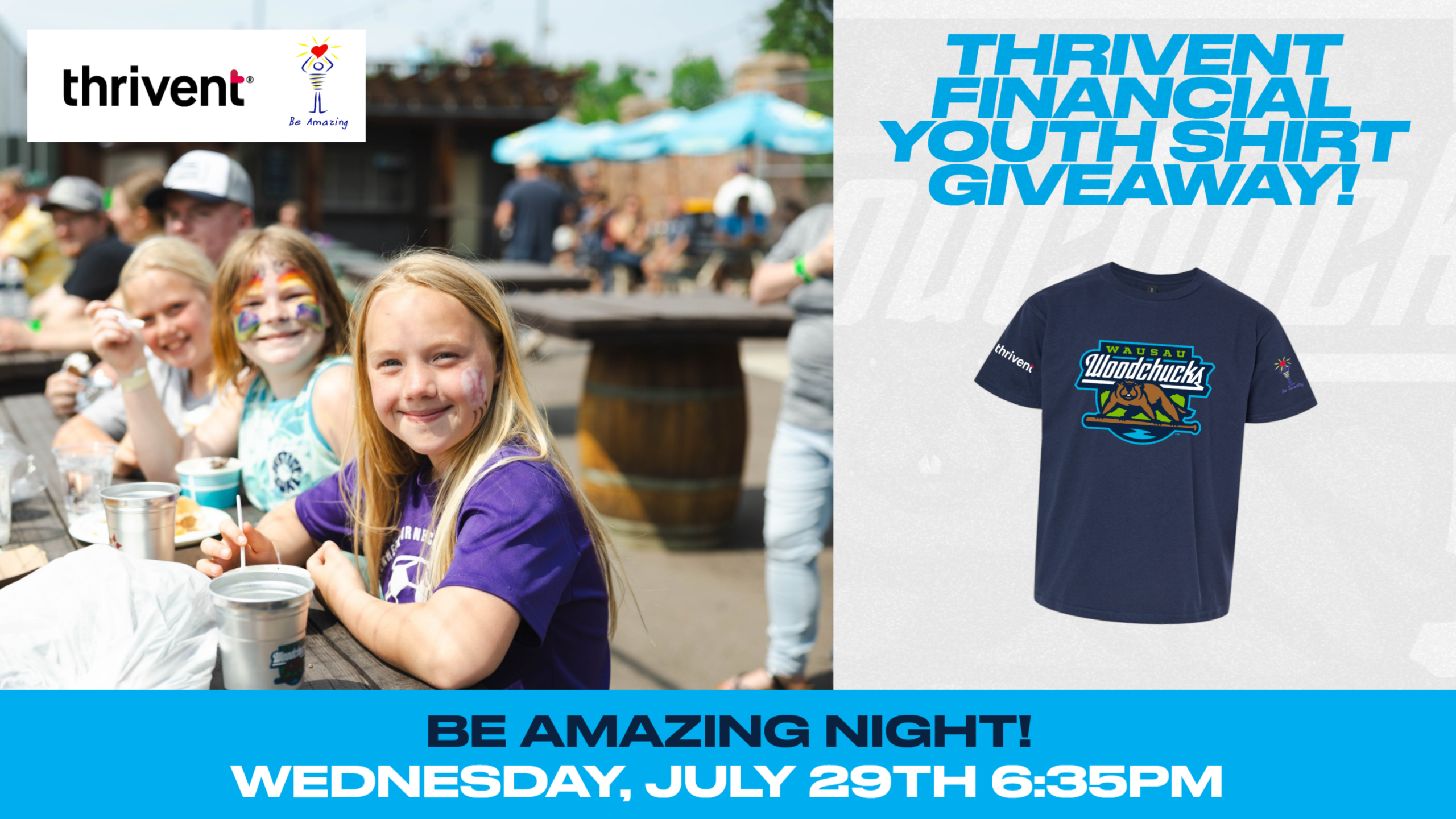 Be Amazing x Thrivent Financial Youth T-Shirt Giveaway: The first 500 youth fans will receive a free Woodchucks T-Shirt courtesy of Thrivent Financial.