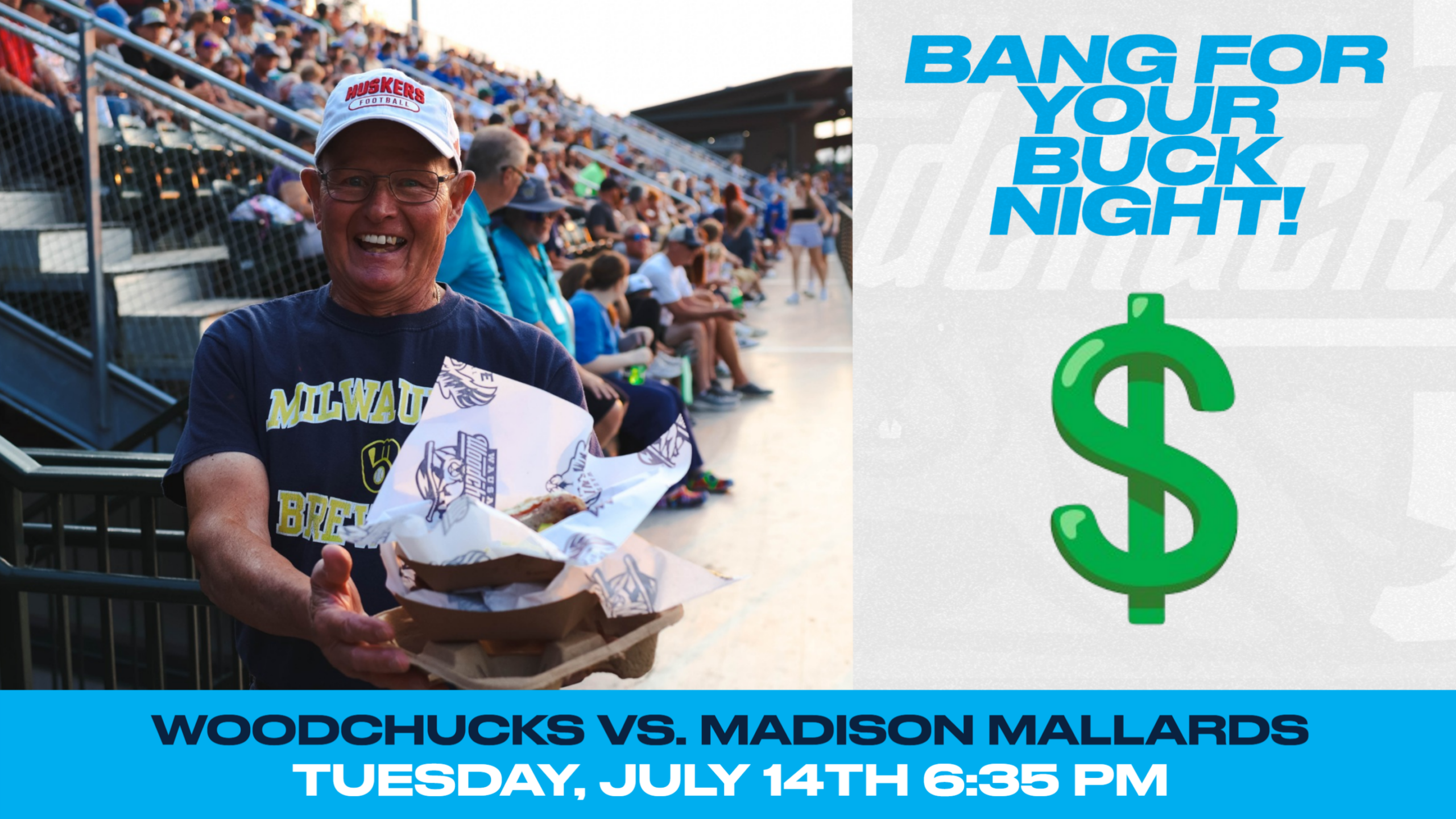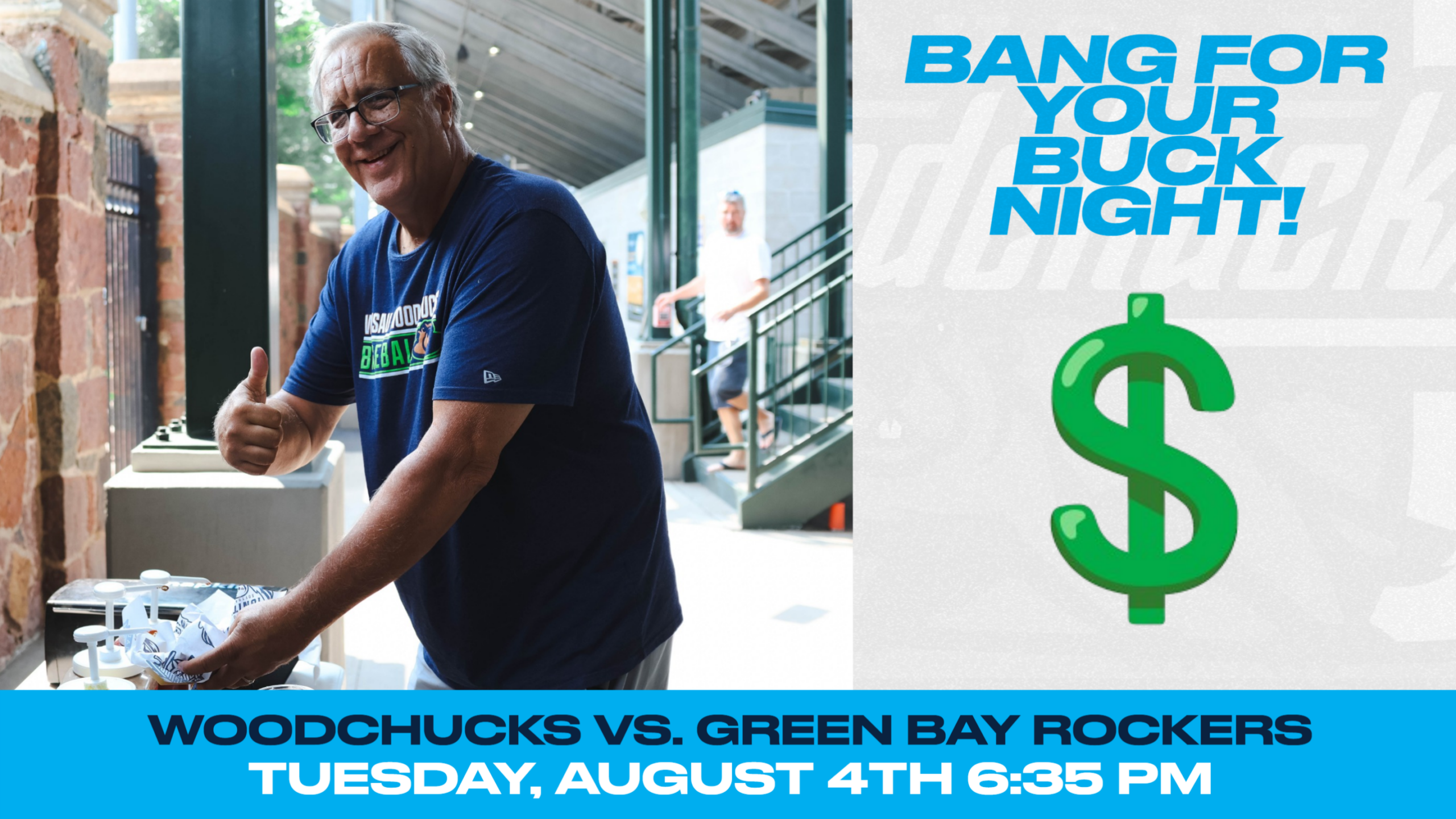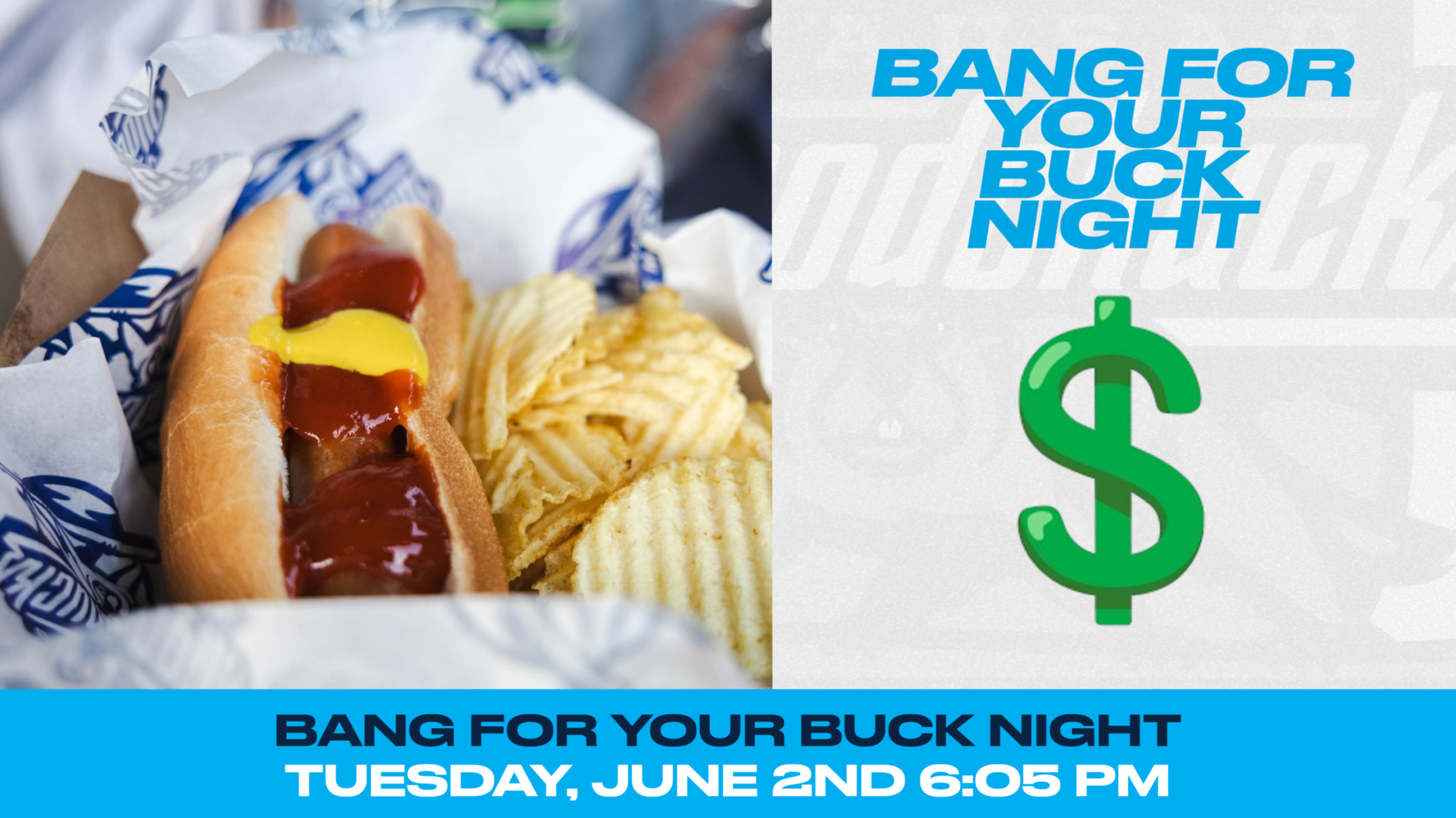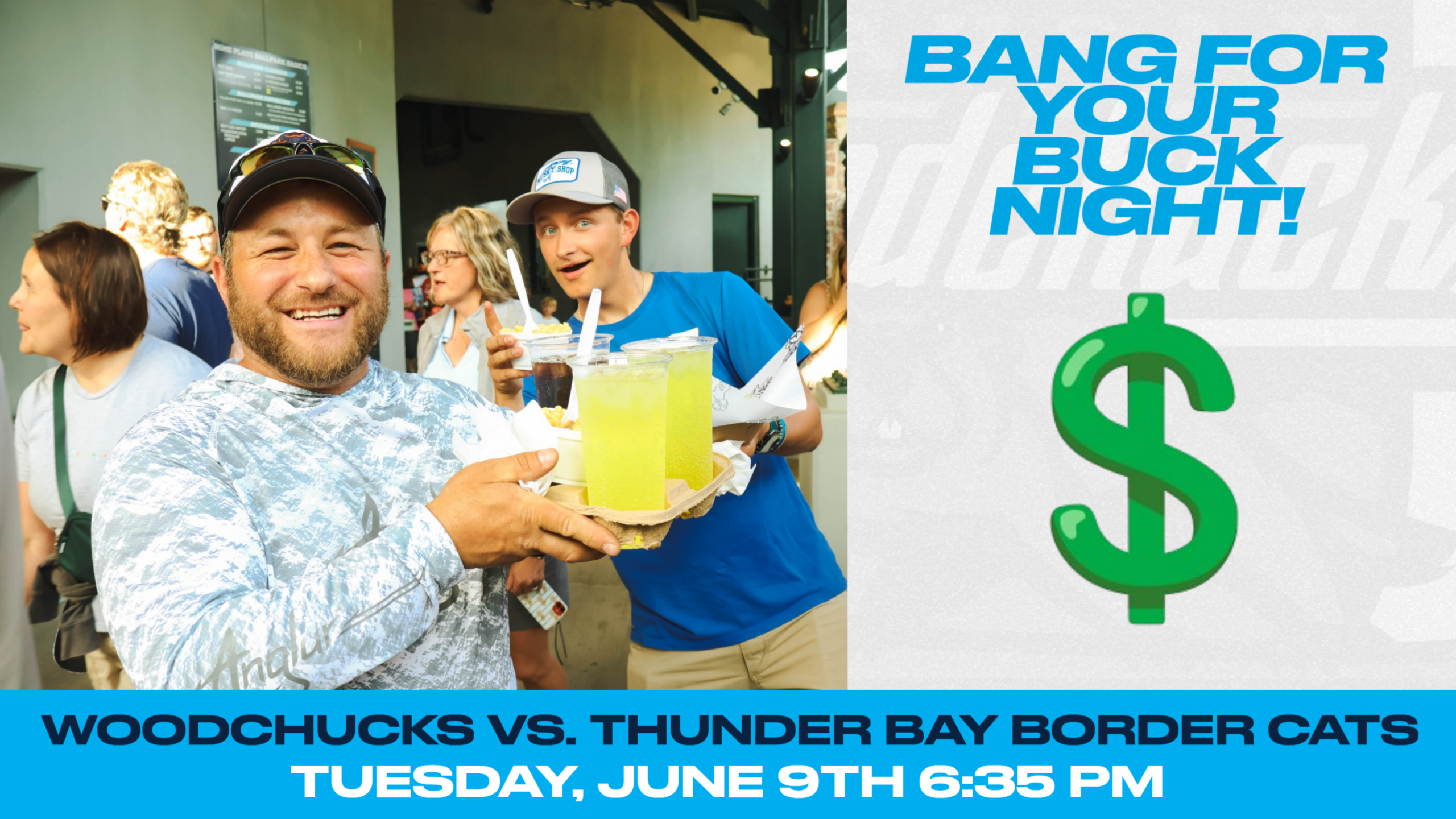 Tuesday, June 2nd vs. Lakeshore Chinooks – 6:05 PM First Pitch Bang for Your Buck Night – $2.00 Hot Dog, $2.00 Tap Soda & $4.00 16oz Domestic Drafts |