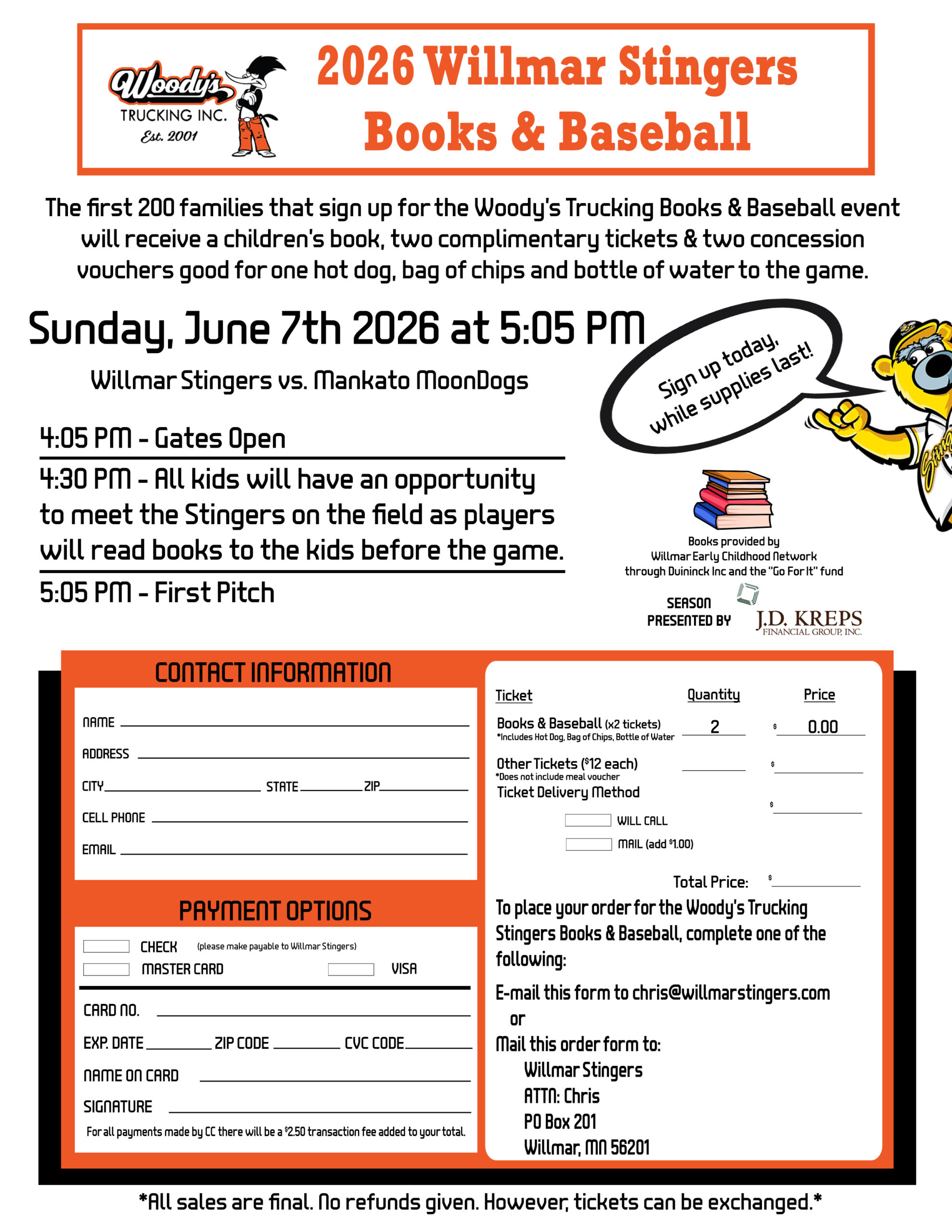 The first 200 families that register for Books & Baseball will receive a children’s book provided by Willmar Early Childhood Network, two complimentary tickets and two concession vouchers good for a ballpark style meal and beverage for the Sunday, June 7th Stingers game courtesy of Woody’s Trucking.